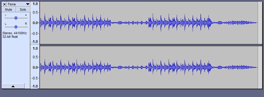 In Audacity, a single channel of sound is represented by one mono audio track; a two-channel (L/R stereo) sound by one stereo audio track. The example below is a stereo track labeled ‘Fiona’, as loaded into Audacity: