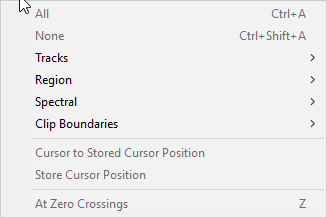 | Clip Boundaries | This submenu allows you to make selections based on any clips you have in a given track: previous clip boundary to cursor; cursor to next clip boundary; all of previous clip; all of next clip. |