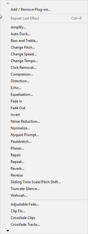 Note that the menu pictured here represents the default effects plug-ins in Audacity as of the 2.2.1 release (and there are a dozen more below those pictured in the menu here). The following table addresses only some of the most familiar effects from among those available. Within and beyond this set, you are encouraged to experiment.