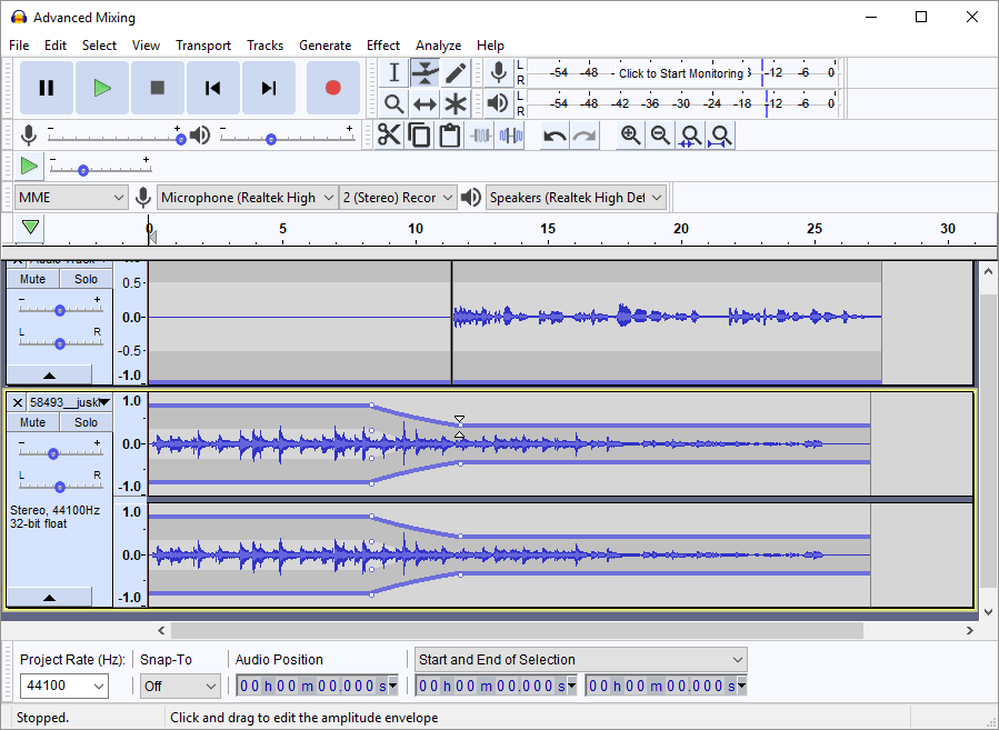 If I determined at this point that the voice track was still too quiet in relation to the music track, I could either increase the overall gain (volume) of the voice track, or decrease that of the music track. A great deal of audio mixing involves playing with the relative volume of different tracks.