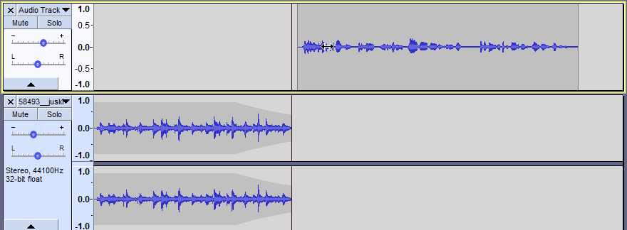 In other cases, however, you might want one track’s waveform to begin only after another track ends entirely, rather than overlapping, as above. For the screenshot below, I have truncated the music track after the fade, so that it will no longer sound in the background of the voice track: