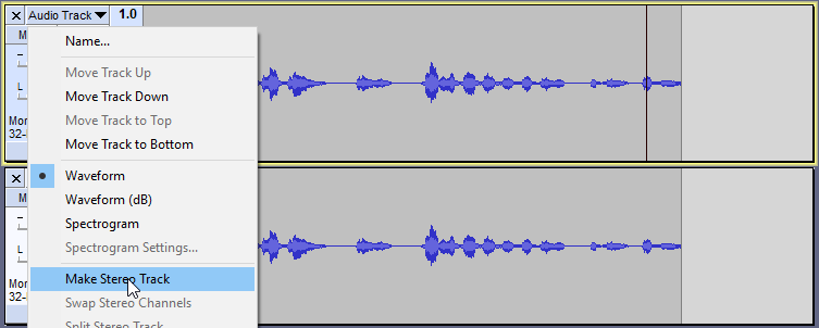 If you wanted instead to have two channels that you could edit or apply effects to separately, you could select the entirety of this track, then go to File > Duplicate, which will create a separate, identical mono track below the first one. Once you’ve edited one or both mono tracks to your satisfaction, you can recombine them into a single, stereo track by going again to the track dropdown of the top track and selecting Make Stereo Track: