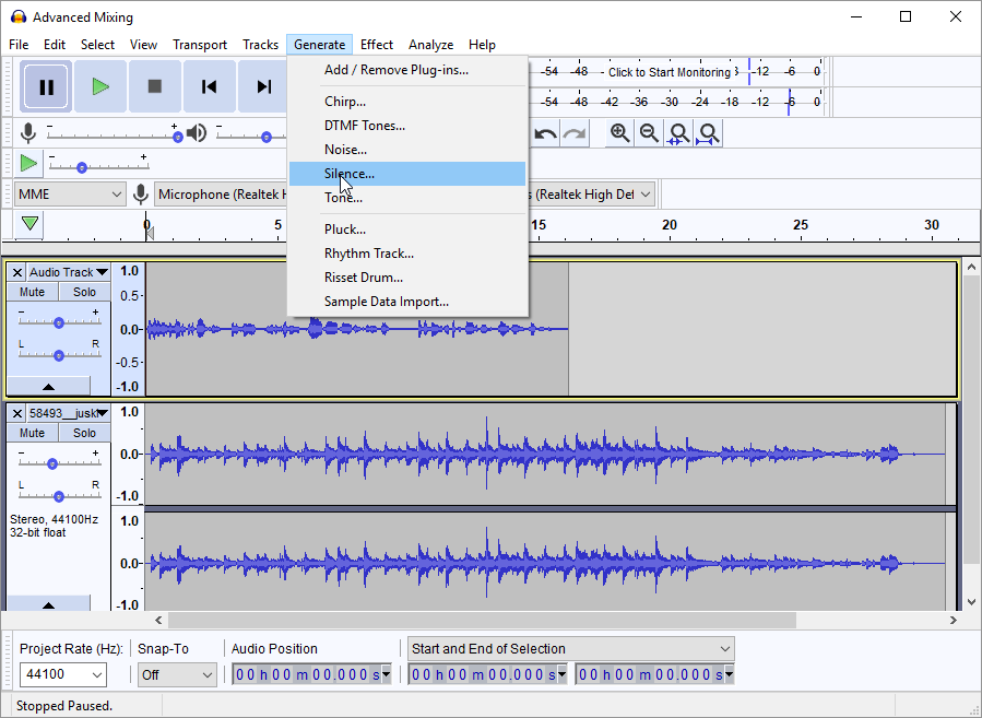We are now ready to insert some silence. Do this by selecting Generate > Silence from the menus at the top of the screen.
