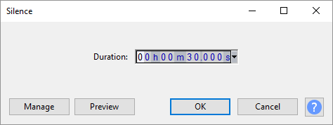 Selecting ‘Silence…’ from the above menu will generate the ‘Silence’ dialog shown below, where we can set the duration of the silence to be inserted. The default silence duration is 30 seconds, as shown. 30 seconds would be quite a long silence in our example, but when you are adding Silence it is easier to add more and then delete some of it than to add in additional silence. So I’m going to keep the default 30 seconds to start with:
