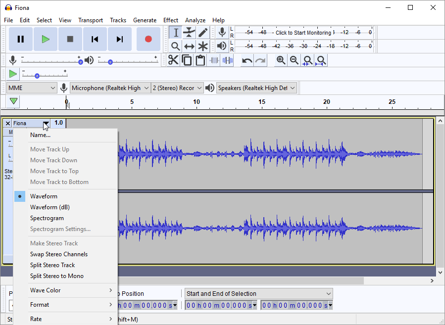In Audacity, a single channel of sound is represented by one mono audio track; a two-channel (L/R stereo) sound by one stereo audio track. The example below is a stereo track labeled ‘Fiona’, as loaded into Audacity: