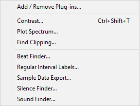 | Add/Remove Plug-ins… | The default plug-ins for Audacity are shown later in this menu: Pluck, Rhythm Track, Risset Drum and Sample Data Import. This option invokes a dialog which allows further plug-ins (for effects, generatiors and analyzers) to be added or removed. |