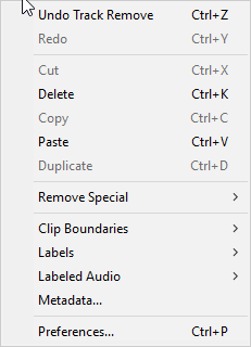 The **Edit Menu **groups together functions for editing audio tracks, labels or metadata in your project: