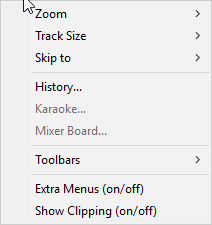 | Track Size | This submenu allows you to zoom in/out so that the entire project fits the width of the project window or the height of that window; it also allows you to collapse all tracks (hiding their mute, solo, pan and volume controls), and to re-expand collapsed tracks |