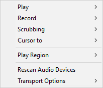 The Transport menu includes the record and playback commands also accessible through the record/playback GUI buttons, with some refinements of these: