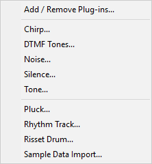 The Generate Menu allows you to insert various generated audio elements (tones, noises and silence) into a track, either extending the track or replacing a selected region, or inserting the element into a new track: