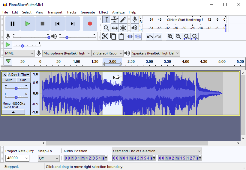 In the above example you can see that I have highlighted the area from about 1:32 to 2:17, a selection of about 45 seconds. To delete this selected region I can now click on the Edit menu and choose ‘Cut’: