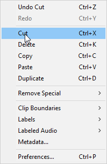 We should observe here that ‘Cut’ and ‘Delete’ are distinct functions, with the important difference that with Cut, the selected audio region is removed from the track but loaded onto the clipboard (from which it can later be Pasted, if desired), while with Delete that segment simply disappears. But with either function, once you select it in the Edit menu you will see that the selected region of your audio track has disappeared, and the length of that track will have been reduced by a corresponding duration: