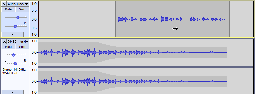 In other cases, however, you might want one track’s waveform to begin only after another track ends entirely, rather than overlapping, as above. For the screenshot below, I have truncated the music track after the fade, so that it will no longer sound in the background of the voice track: