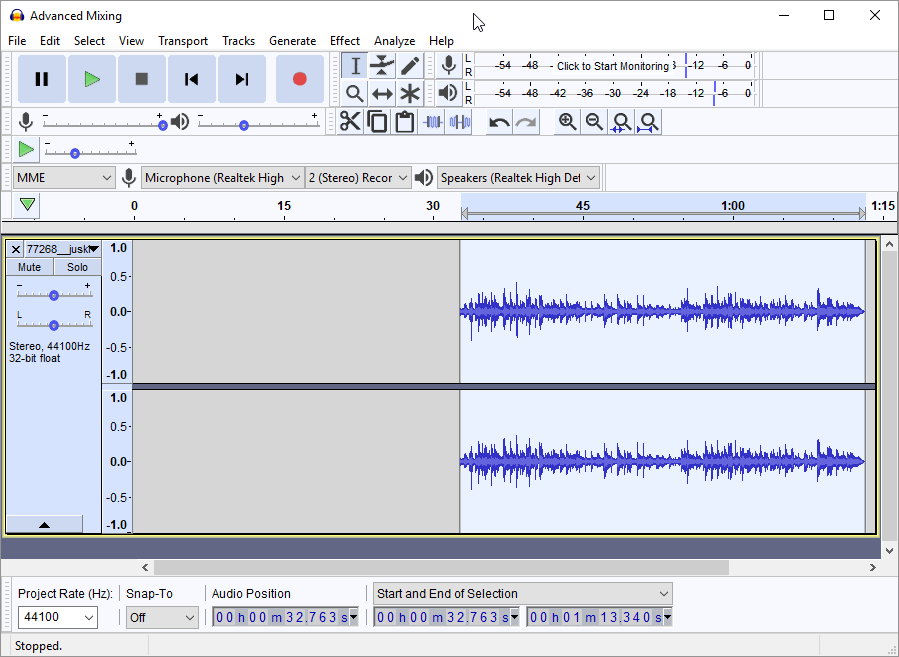 Notice that the first 32 seconds is now gone, but the remaining audio waveform has not shifted to the left (to 0 seconds), as it would have had we instead selected the first 32 seconds and used Edit > Cut or Edit > Delete. Trimming is therefore a good way to preserve the relative position of a segment of audio track in relation to other tracks in the project, and to the overall timeline.