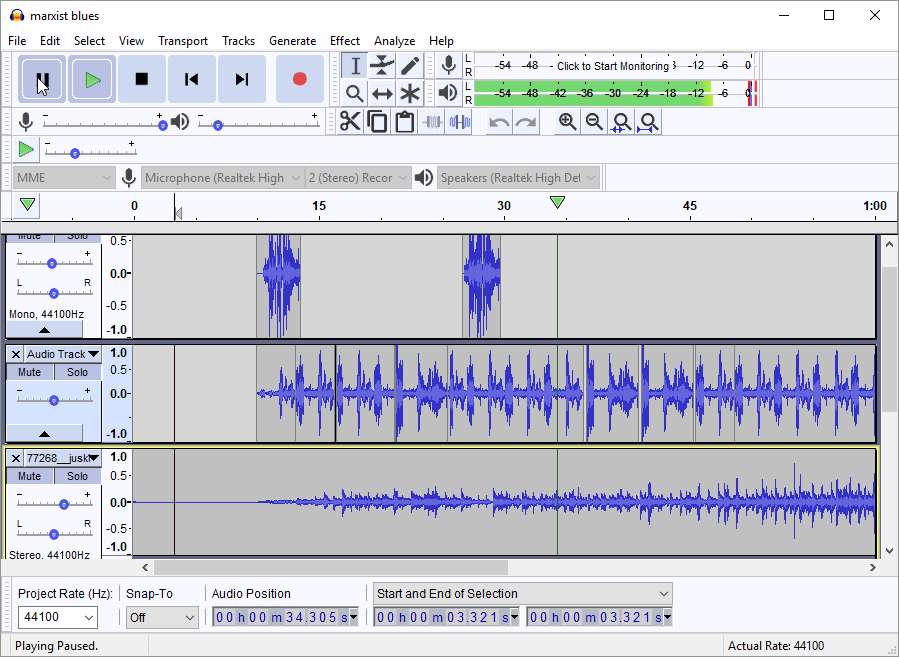 Visible here are the top three tracks of a five-track audio project I created. It is structured around two main elements: a blues-guitar segment (third track down, duplicated once end-to-end to produce the overall song length), and the purring and vocalization of an old cat named Marx, from an originally quite short sound recording which has been edited and duplicated numerous times in track two, resulting in a continuous 1:45 audio track of purring punctuated by a short plaintive meow at regular intervals. The short, intense waveform segments pictured in track one represent the sound of a spoon dropped on the kitchen floor, an incidental noise in the original Marx recording that I picked out, amplified and used for further periodic punctuation. As with any other kind of collage, audio collage like this either ‘works’ or doesn’t for a given listener; you can decide for yourself in this case: https://www.youtube.com/watch?v=oaqPzmURSMo . The point here is simply to illustrate the enormous scope for creativity made possible by the relative handful of editing tools we have surveyed in Audacity so far.