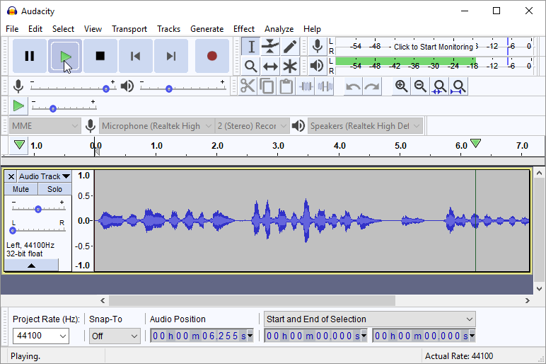 If we now play the one remaining track, we’ll be able to hear that the sound is only coming through one channel (L). This can be seen in the green signal of the Playback meter in the screenshot below: