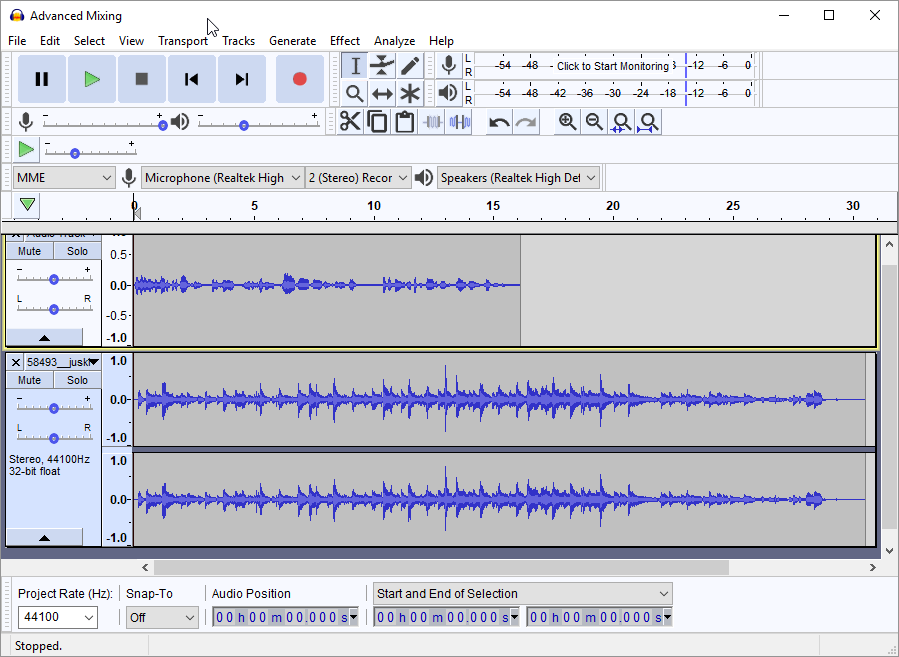 Here I have loaded an audio track (in mono), and a stereo music track beneath it: