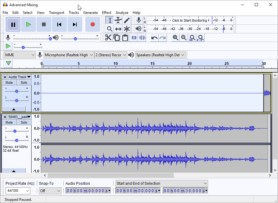 As noted above, 30 seconds is a very long silence for our purposes; after some experimental listening I will end up cutting it down to 11 seconds. Meanwhile, note that the actual audio wave form of the vocal track has been pushed all the way to the far right of the window; in othe words the total voice track is now 30 seconds longer, including the silence at the beginning.