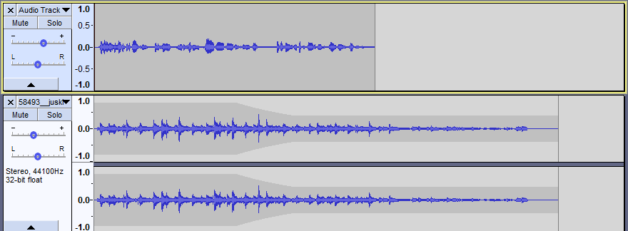 In other cases, however, you might want one track’s waveform to begin only after another track ends entirely, rather than overlapping, as above. For the screenshot below, I have truncated the music track after the fade, so that it will no longer sound in the background of the voice track: