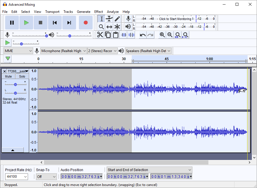 then, using the mouse cursor, we select the region of the track after the 32-second mark. Note that for purposes of trimming, we select the segment of the track we want to keep, not the part we want to discard: