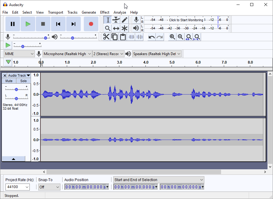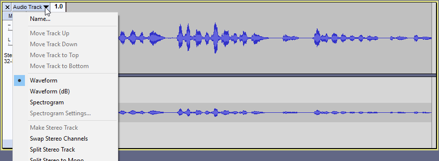 If you wanted instead to have two channels that you could edit or apply effects to separately, you could select the entirety of this track, then go to File > Duplicate, which will create a separate, identical mono track below the first one. Once you’ve edited one or both mono tracks to your satisfaction, you can recombine them into a single, stereo track by going again to the track dropdown of the top track and selecting Make Stereo Track: