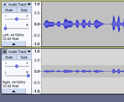 Below we see a recorded track with one channel (the left) much louder than the other: